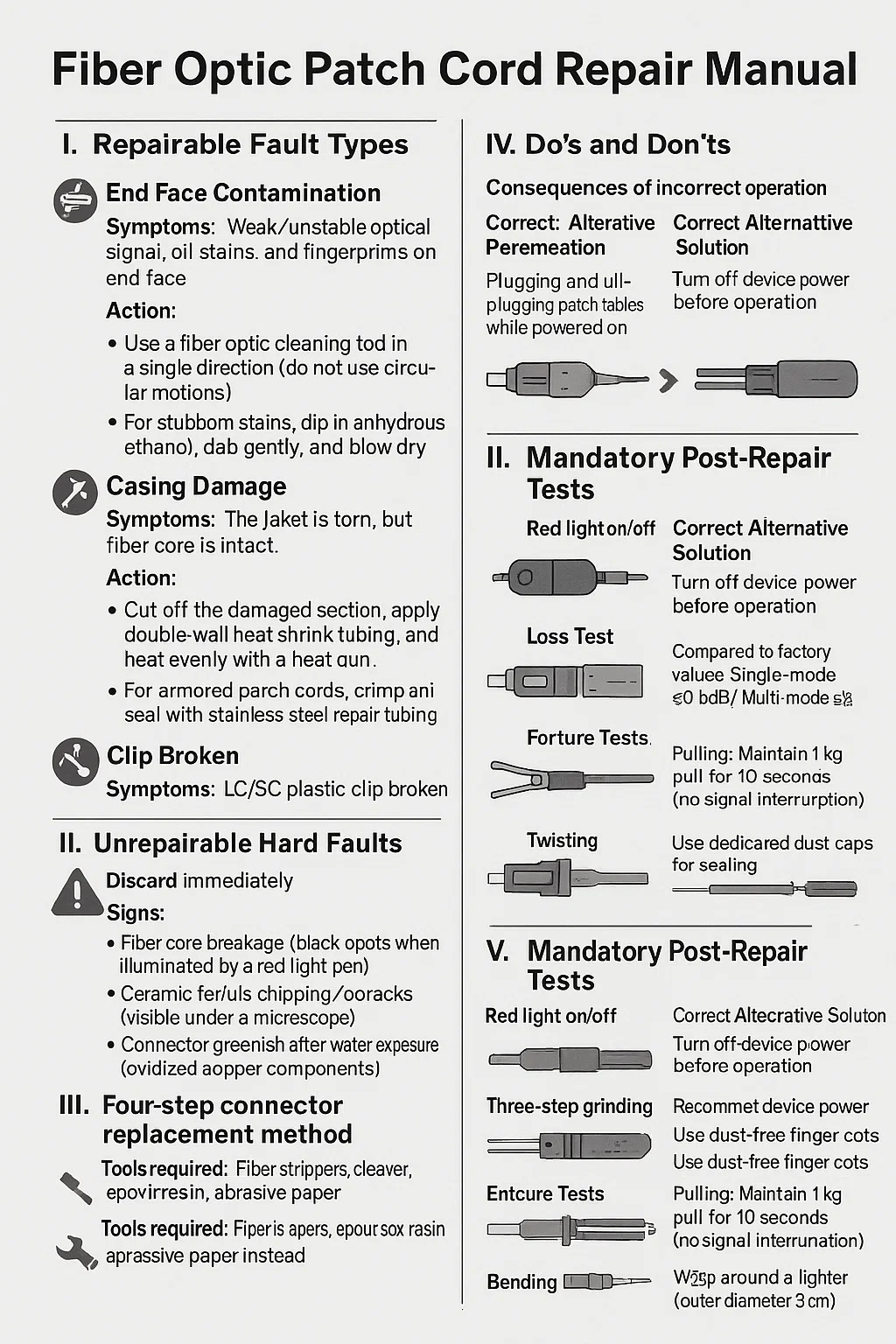 Rimozione dell'estremità della fibra: tagliare l'estremità danneggiata, lasciando almeno 15 cm di fibra in eccesso. Rimuovere 3 cm di rivestimento esterno e pulire il nucleo in fibra con una salvietta imbevuta di alcol. Infilare un nuovo connettore. Inserire la fibra nuda in un nuovo manicotto in ceramica LC/SC. Iniettare la resina epossidica blu e polimerizzare per 30 minuti. Taglio di precisione: utilizzare una mannaia per fibre per rimuovere verticalmente il nucleo in fibra in eccesso. La sezione trasversale deve sporgere ≤0,5 mm dal manicotto. Lucidatura finale della faccia