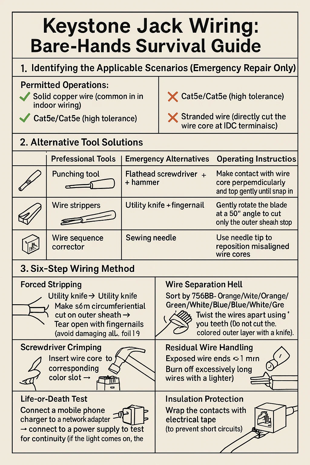 | Strumento di punch-down | Martello per cacciavite a testa piatta | • Lama PERPENDICOLARE al punto di contatto• Colpi leggeri SOLO fino all'inserimento del filo• NON fare indiscrezioni! | (fatale) |