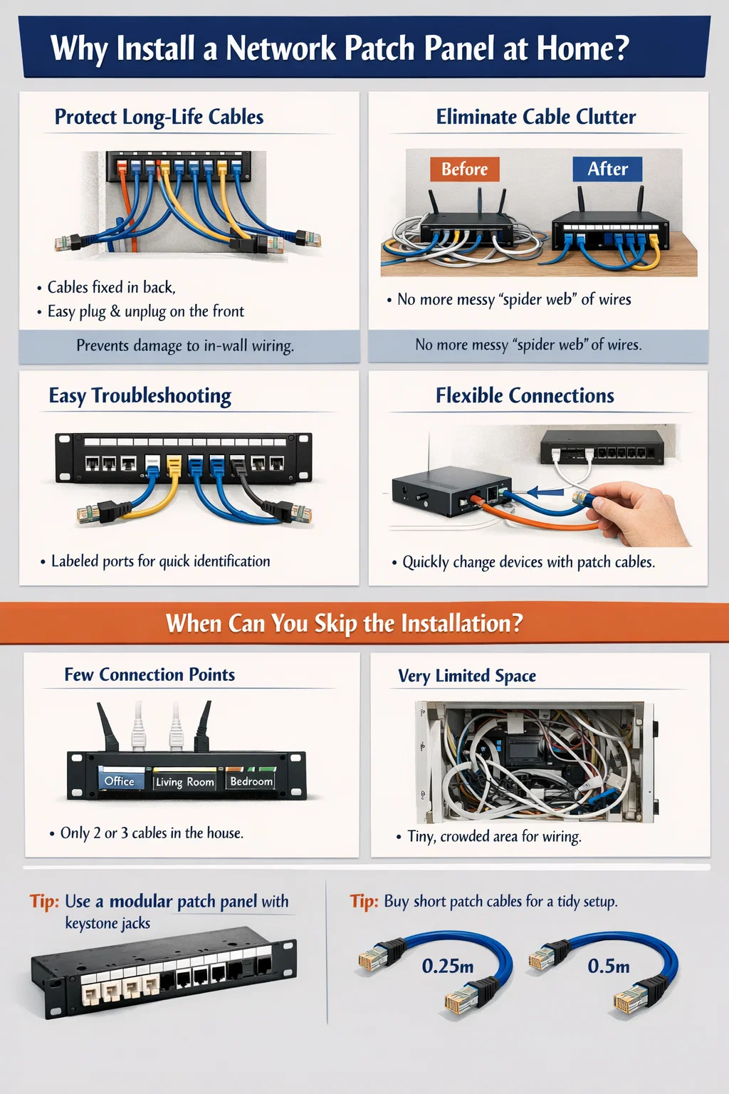 Se i cavi passano in ogni stanza della casa, potrebbero esserci da 5 a 10 cavi di rete nella scatola a bassa tensione. Collegandoli direttamente al router si crea un groviglio di cavi che rende impossibile chiudere la porta dell'armadio. Con un pannello patch, tutti i cavi sono disposti ordinatamente in fila, ogni porta è numerata, il che è visivamente gradevole.