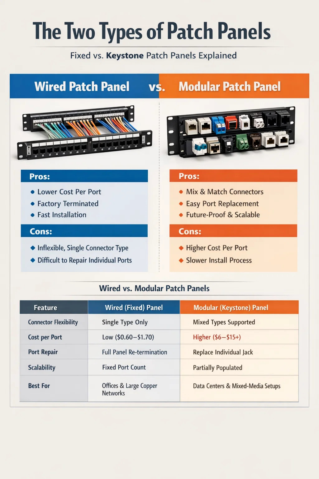 I due tipi principali di patch panel sono pannelli di permutazione cablati (fissi). e pannelli di permutazione modulari (keystone). . Queste due categorie costituiscono la base del cablaggio strutturato praticamente in ogni data center, sala server e installazione di rete commerciale. Comprendere la differenza tra loro è essenziale prima di acquistare un pannello di connessione di rete o progettare un layout di cablaggio, perché la scelta sbagliata può creare costi inutili, inflessibilità o problemi di prestazioni in futuro.