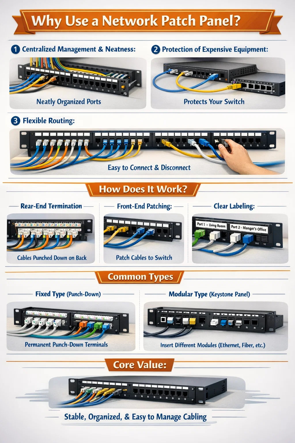 I cavi di rete nelle pareti sono generalmente piuttosto rigidi (nucleo in rame a filo singolo) e collegamenti e scollegamenti frequenti possono facilmente rompere o danneggiare le porte dello switch. Utilizzando un pannello patch, è possibile collegare il pannello patch e lo switch con cavi patch flessibili. Anche se sono necessari frequenti cambi di collegamento, verranno danneggiati solo i cavi patch economici, non i cavi principali nel muro.
