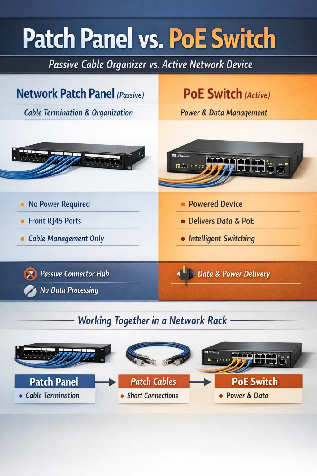 La differenza principale risiede nella loro natura fondamentale: a pannello di permutazione della rete è un componente hardware passivo utilizzato per l'organizzazione e la terminazione dei cavi, mentre a Interruttore PoE è un dispositivo elettronico attivo che gestisce il traffico dati e fornisce energia elettrica tramite cavi Ethernet. Un patch panel non necessita di elettricità e non può elaborare dati; uno switch PoE richiede una fonte di alimentazione e funge da "cervello" della rete locale.